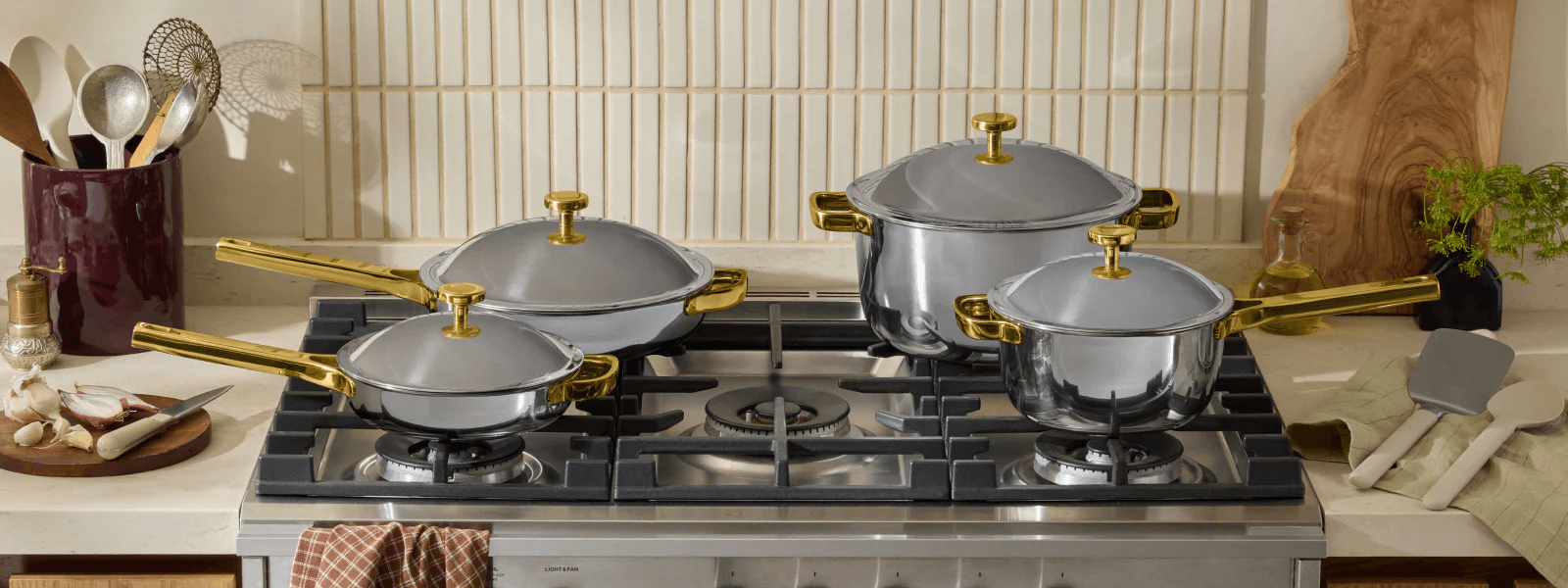 This collab is pure livable luxe. This Limited Edition version of the Home Cook Duo comes in Espresso* or Cream and includes the Perfect Pot and Always Pan — both finished with gold knobs and paired with darker wooden spatulas. It’s as chic as cookware gets.